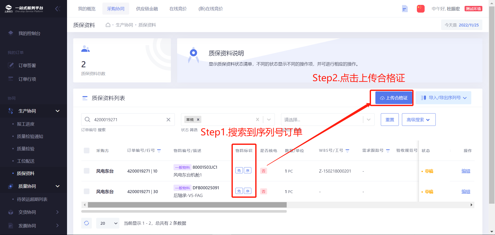上传完质保资料附件后,可以勾选状态为草稿的订单行,点击批量提交