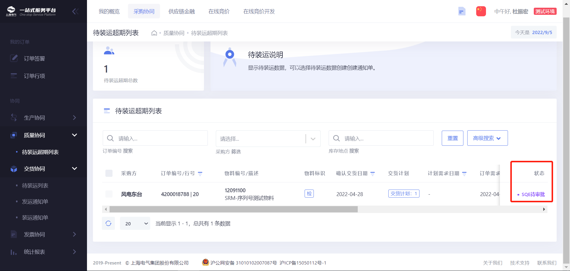 - 待装运超期订单查看:采购协同>质量协同>待装运超期列表